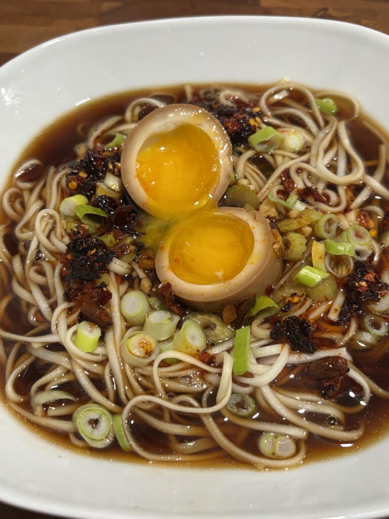 4.) Top noodles with green onions, chili crunch oil, a Mayak egg, cut in half, and juice from 1 lime wedge.